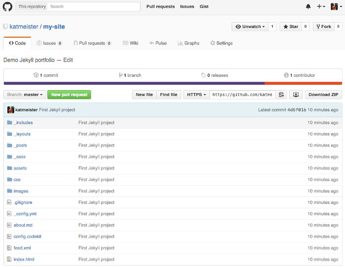 |-- index.html # index du site C’est l’arborescence par défaut. Tout dossier dont le nom commence par un tiret bas _ ne sera pas généré tel quel. Par exemple quand Jekyll va générer votre site, il ne va pas créer un dossier layouts, par contre il générera le fichier index.html puisqu'il n'y a pas de tiret bas devant.