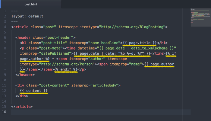 Si vous ouvrez le fichier post.html dans le dossier _layouts, nous pouvons le voir en action.